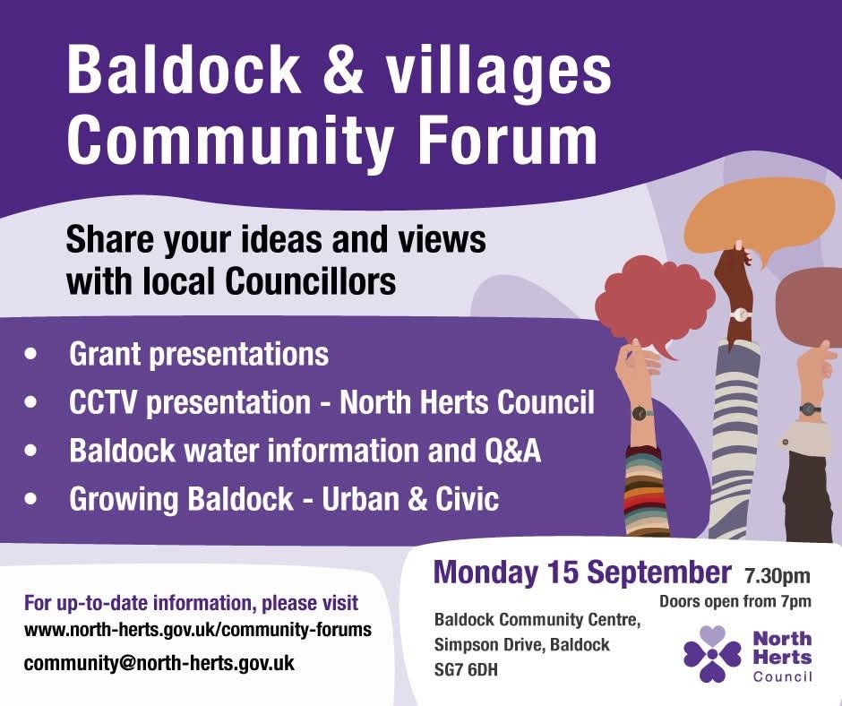 There are similar community forum meetings on 24 September in Royston and Letchworth which everyone is welcome to attend if the Baldock one isn't convenient.